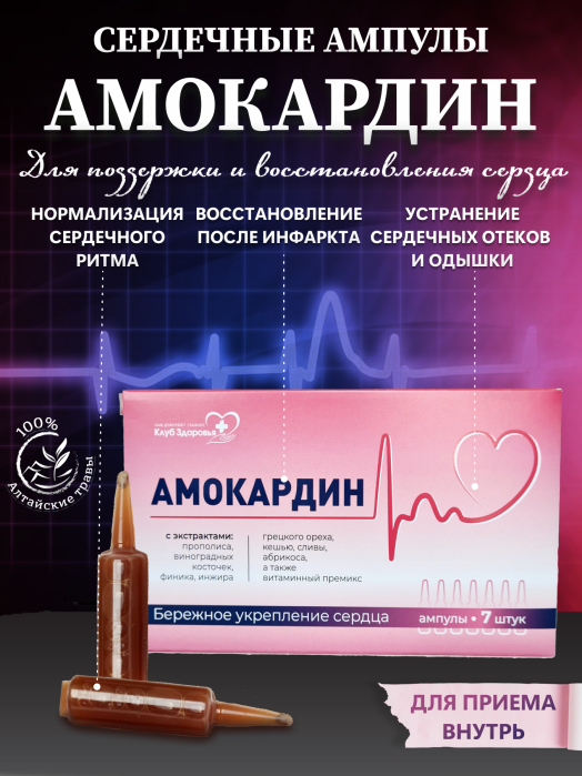 Препарат Амокардин создан на основе уникальной формулы академика Николая Амосова и представляет собой современное средство для комплексной поддержки сердечно-сосудистой системы и головного мозга. Амокардин ампулы, а не таблетки — такая форма удобна для приема внутрь и обеспечивает высокую биодоступность активных компонентов.
