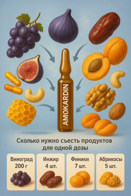 Чтобы получить эквивалент одной дозы Амокардина, пришлось бы съесть за один приём и запомнить дозировки сразу нескольких видов продуктов — а ампулу достаточно просто развести в воде и принять.